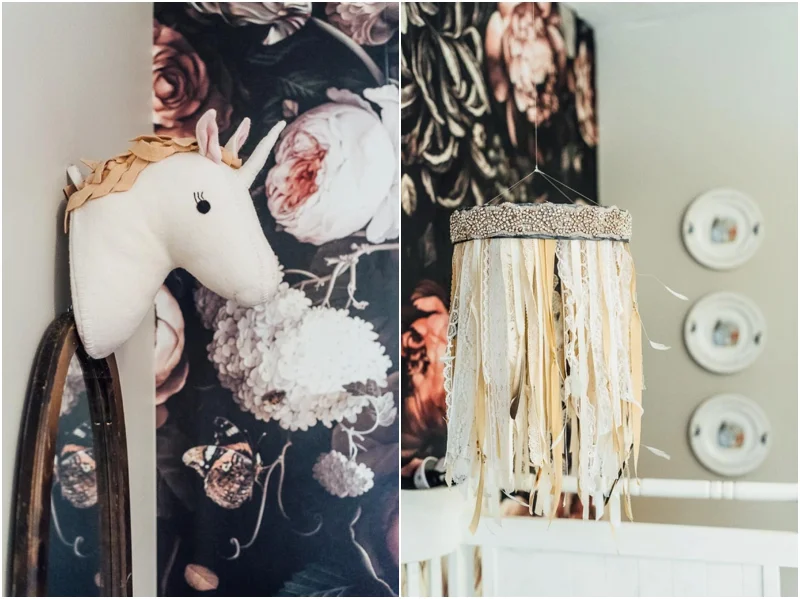 So my search began and while browsing Pinterest, I came across this blog where she featured a floral wallpaper used in her daughters room that I loved. After browsing the Ellie Cashman wallpapers, blowing up my mom and sisters' phones, I finally settled on the Dark Floral II Black Saturated XL (200%) Wallpaper .